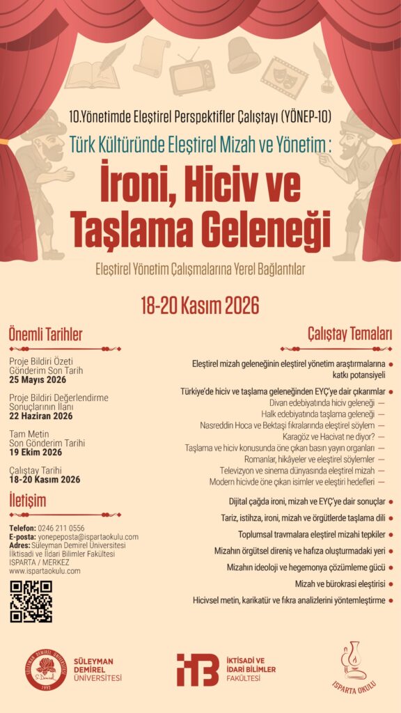 Yönetim alanına eleştirel bir merakla yaklaşan, yerleşik kabulleri sorgulamayı ve alternatif düşünme imkânlarını çoğaltmayı amaçlayan Yönetimde Eleştirel Perspektifler (YÖNEP) Çalıştayı’nın onuncusu, 18-20 Kasım 2026 tarihinde Isparta’da Süleyman Demirel Üniversitesi İktisadi ve İdari Bilimler Fakültesi’nde gerçekleştirilecektir. Çalıştayın ana teması “Türk Kültüründe Eleştirel Mizah ve Yönetim: İroni, Hiciv ve Taşlama Geleneği” olarak belirlenmiştir. Eleştirel yönetim çalışmalarını mizah, hiciv ve taşlama geleneğiyle buluşturarak yerel kültürel birikimin sunduğu düşünsel imkânların tartışmaya açılması ve böylece eleştirel yönetim çalışmalarına yerel bağlantılar kurulması amaçlanmıştır. Bu genel çerçeve altında; eleştirel mizah geleneğinin eleştirel yönetim araştırmalarına katkı potansiyeli, Türkiye’de hiciv ve taşlama geleneğinden eleştirel yönetim çalışmalarına dair çıkarımlar, toplumsal travmalara eleştirel mizahi tepkiler, mizahın örgütsel direniş ve hafıza oluşturmadaki yeri, mizahın ideoloji ve hegemonya çözümleme gücü, mizah ve bürokrasi eleştirisi, hicivsel metin, karikatür ve fıkra analizlerini yöntemleştirme gibi temaların altında pek çok konunun derinlemesine ele alınması hedeflenmektedir. Çalıştay günleri boyunca, farklı oturumlarla yürütülecek çalıştayda bildiriler sunularak tartışılacaktır. Her bildiriye 15 dakika sunum, 30 dakika tartışma olmak şartıyla toplamda 45 dakika süre ayrılacaktır. Çalıştaya bildirisiz katılım yapılamayacaktır. Çalıştay sonunda seçilen bildiriler kitaplaştırılacaktır (bildiri kitabı değil, editörlü e-kitap/kitap olarak yayınevi tarafından basılacaktır). Çalıştayla ilgili ayrıntılı bilgilere https://ispartaokulu.com/yonep2026 adresinden ulaşılabilir. Ana temayla düşünsel bağ kuran, eleştirel mizahın imkânlarını yönetim alanında birlikte tartışmak isteyen tüm araştırmacıları YÖNEP-10’a katkı sunmaya davet ediyoruz.